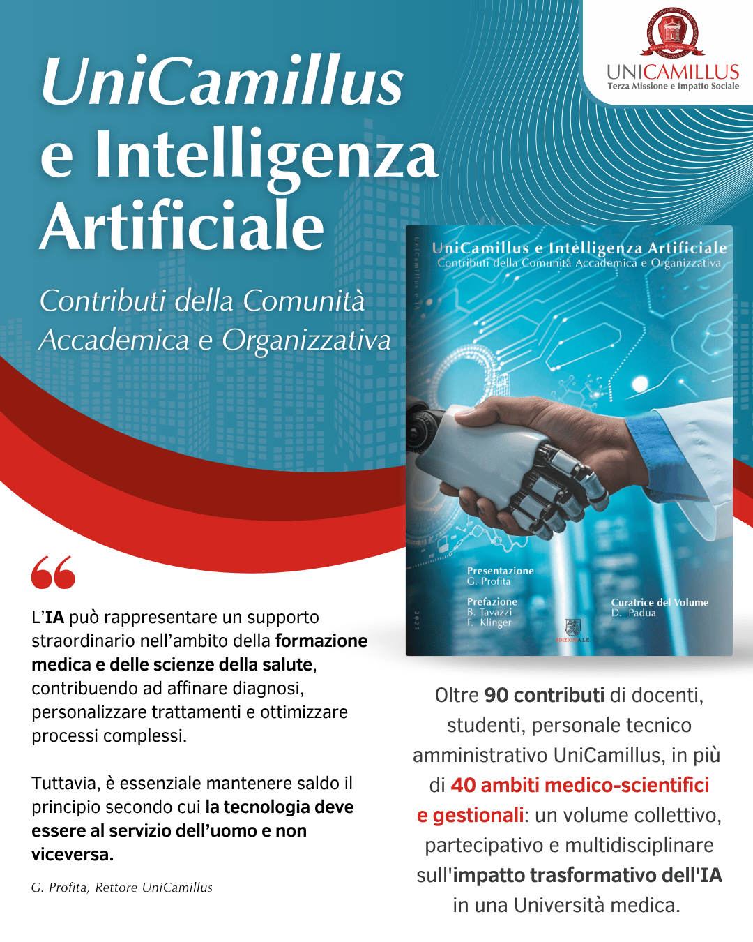 Un progetto nato dall’impegno della comunità accademica e organizzativa, con oltre 90 contributi di docenti, studenti, personale tecnico-amministrativo di UniCamillus, in più di 40 ambiti medico-scientifici e gestionali: un volume collettivo, partecipativo e multidisciplinare sull’impatto trasformativo dell’IA in una Università medica.