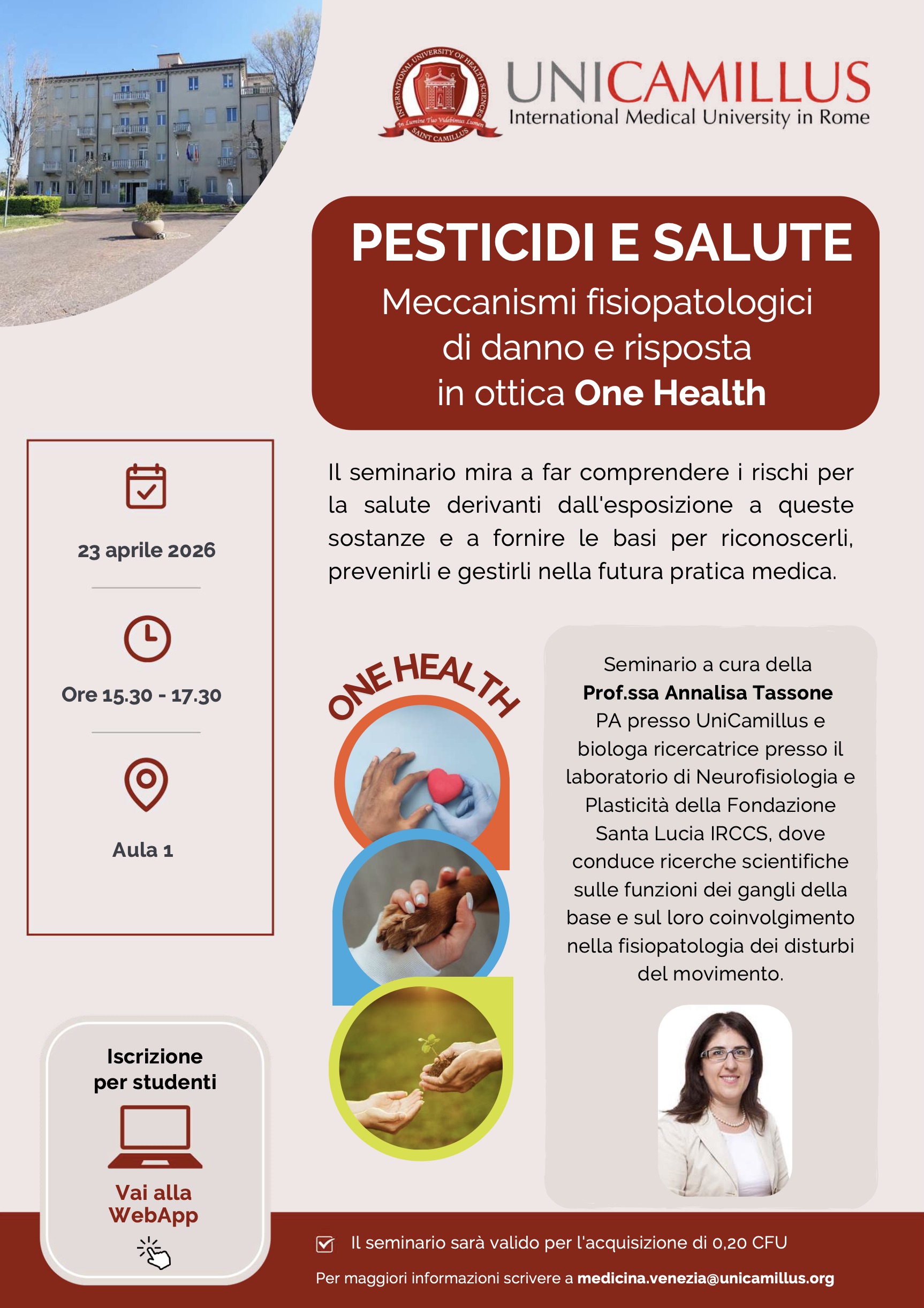 Seminar delivered by Prof. Annalisa Tassone, Associate Professor at UniCamillus and research biologist at the Laboratory of Neurophysiology and Plasticity of the Fondazione Santa Lucia IRCCS, where she conducts scientific research on the functions of the basal ganglia and their involvement in the pathophysiology of movement disorders.
