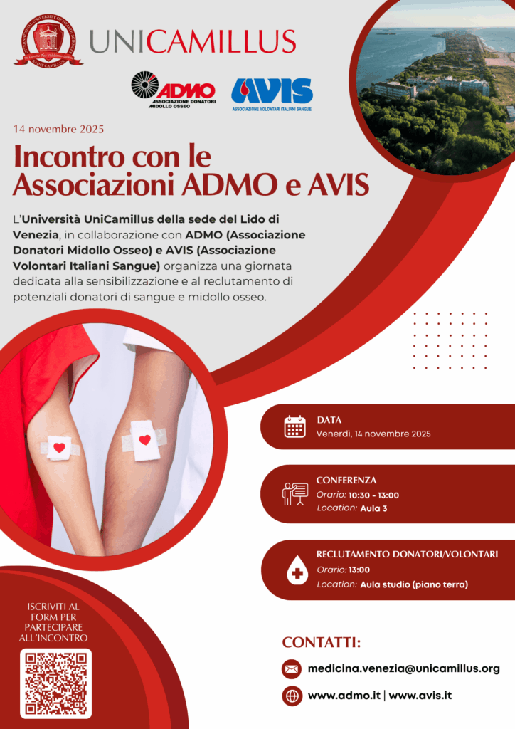 L’Università UniCamillus della sede del Lido di Venezia, in collaborazione con ADMO (Associazione Donatori Midollo Osseo) e AVIS (Associazione Volontari Italiani Sangue) organizza una giornata dedicata alla sensibilizzazione e al reclutamento di potenziali donatori di sangue e midollo osseo.