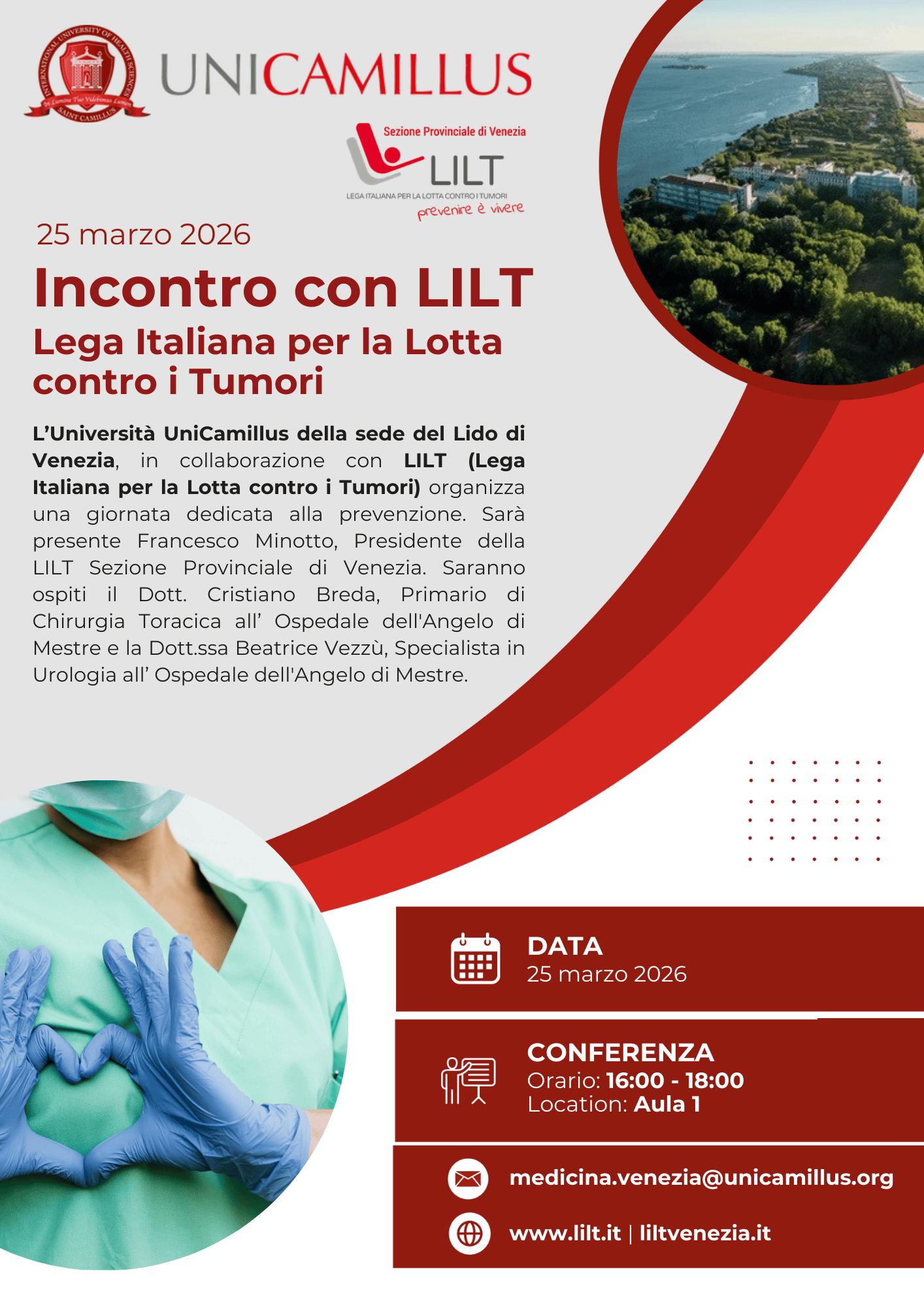 L’Università UniCamillus della sede del Lido di Venezia, in collaborazione con LILT (Lega Italiana per la Lotta contro i Tumori) organizza una giornata dedicata alla prevenzione. Sarà presente Francesco Minotto, Presidente della LILT Sezione Provinciale di Venezia. Saranno ospiti il Dott. Cristiano Breda, Primario di Chirurgia Toracica all’ Ospedale dell’Angelo di Mestre e la Dott.ssa Beatrice Vezzù, Specialista in Urologia all’ Ospedale dell’Angelo di Mestre.