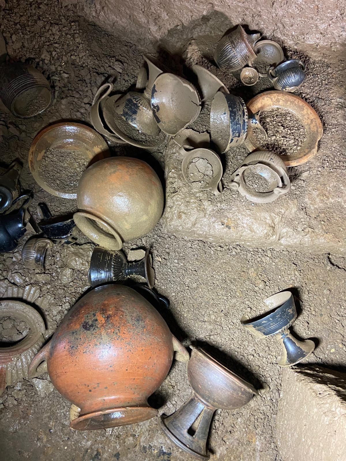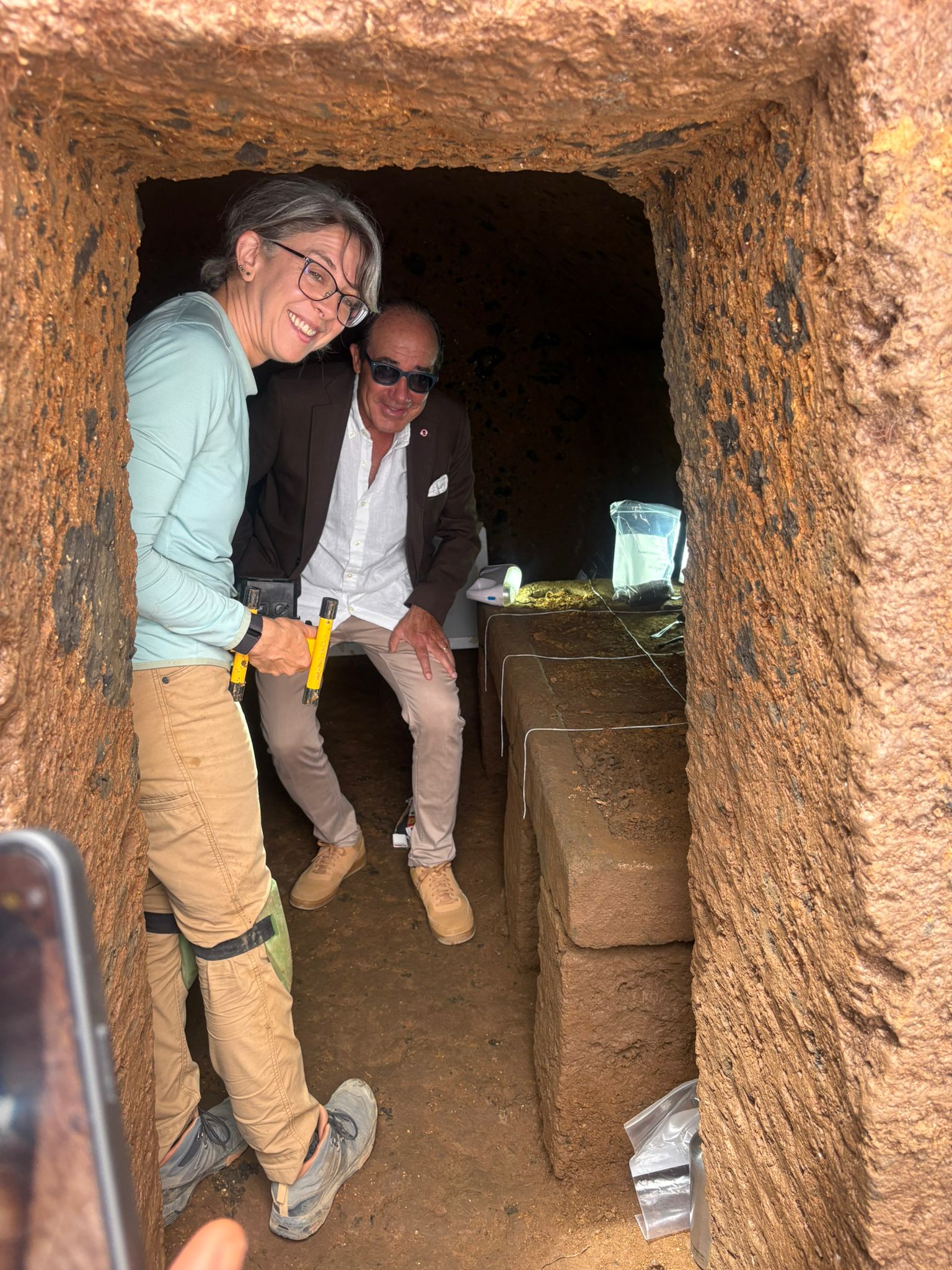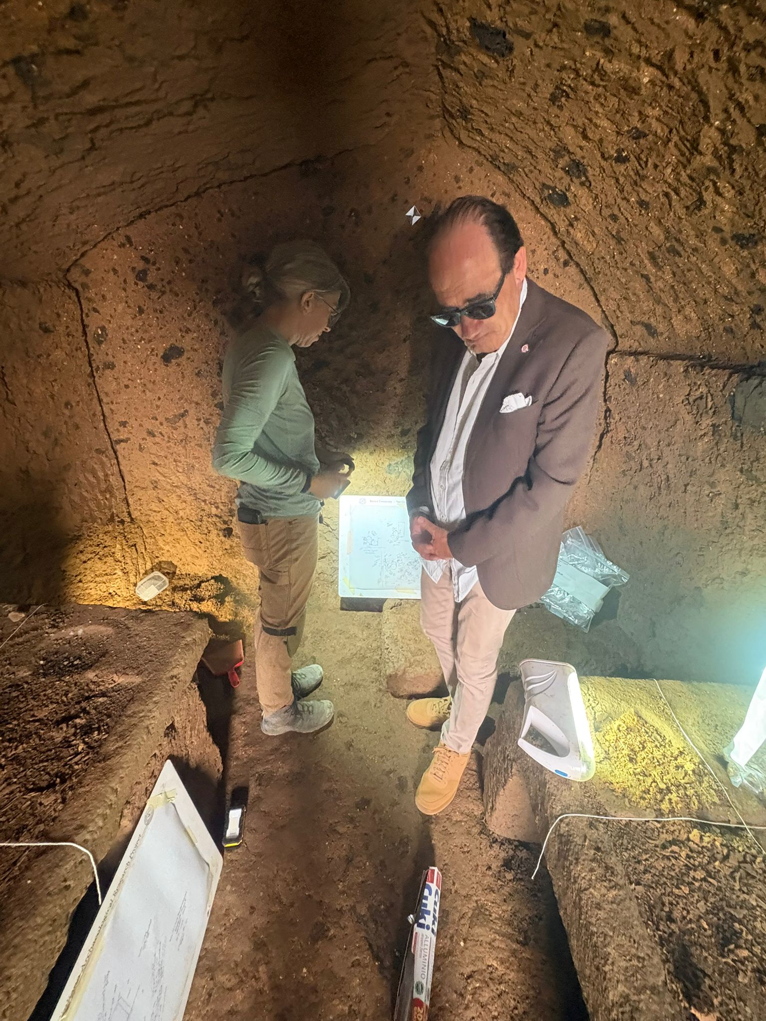 La tomba, sigillata da oltre 2.600 anni, ha restituito una camera sepolcrale intatta. «Il fatto che la tomba non sia mai stata violata, né in epoca romana né moderna, è straordinario – racconta il Prof. Davide Zori – L’accesso avveniva tramite un profondo dromos (corridoio), al termine del quale il team ha trovato una lastra di tufo integra che sigillava l’ingresso alla camera sepolcrale. Rimosso il portale, la tomba ha rivelato un eccezionale corredo funerario e i resti di quattro individui adagiati su letti scolpiti nel nenfro».